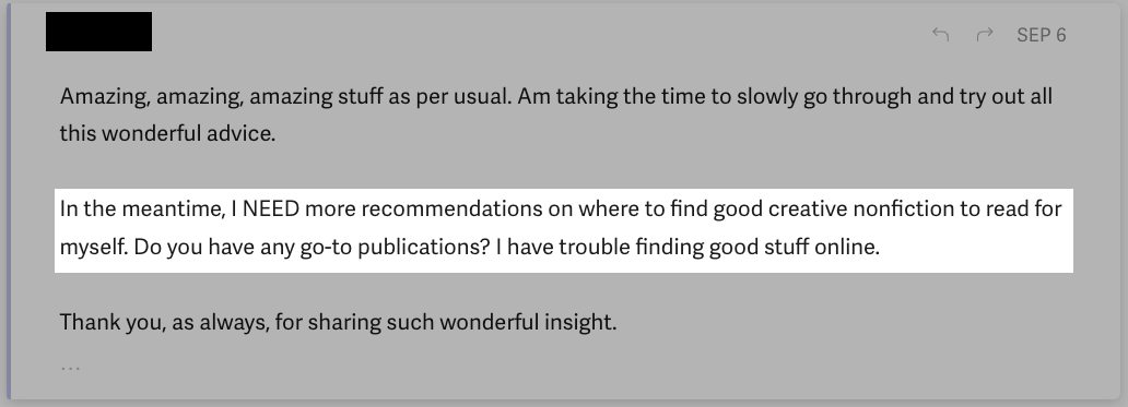 Many of you reached out, in video comments and email replies, to say how excited you felt in discovering the genre of creative nonfiction. Some of you asked for more.